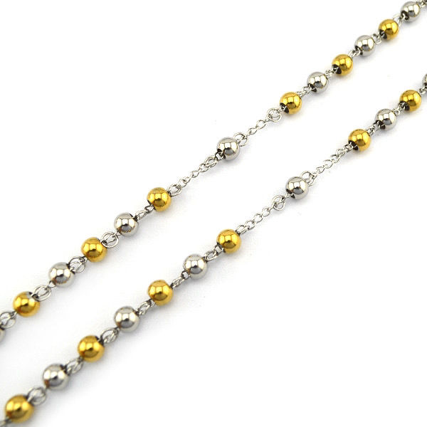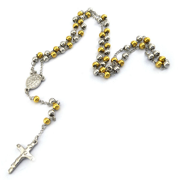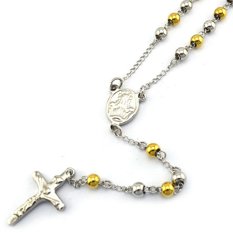 This is a beautifull hand crafted stainless steel rosary necklace in gold and silver color. Length and thickness is 26" * 5/16".