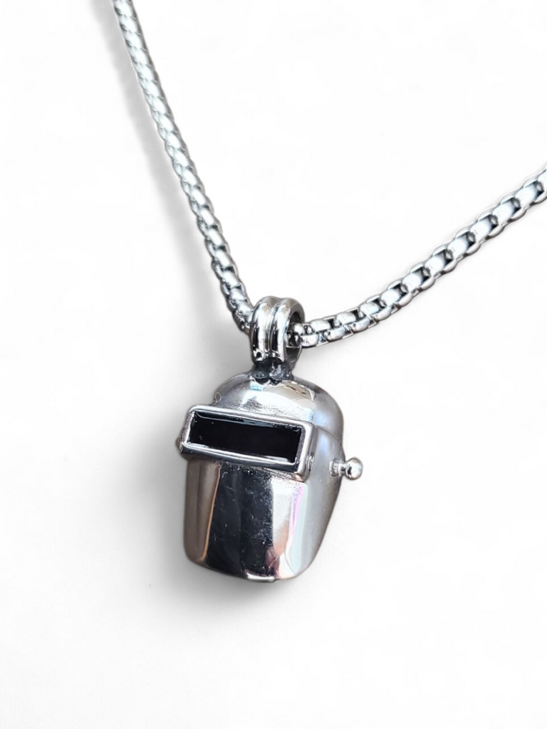 Elevate your style with this striking 316L stainless steel welding hood pendant set. It features a meticulously crafted 1-inch pendant paired with a durable 23.5-inch stainless steel box chain, offering a sleek and polished look that resists tarnishing and corrosion. Perfect for those who appreciate rugged, industrial-inspired design.