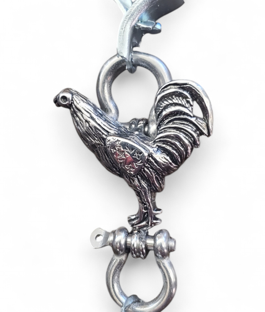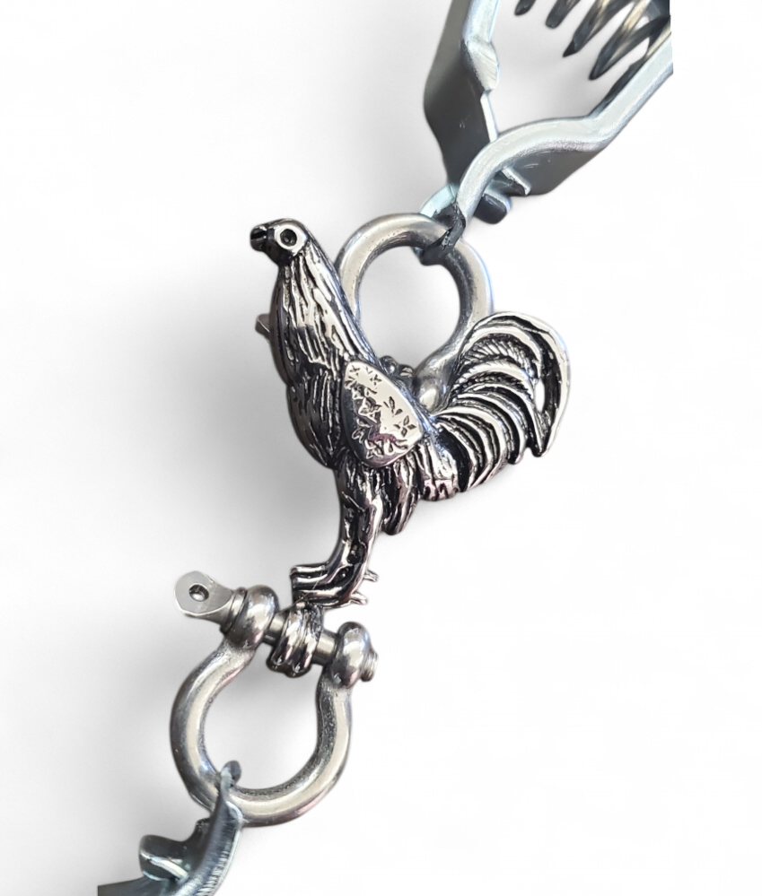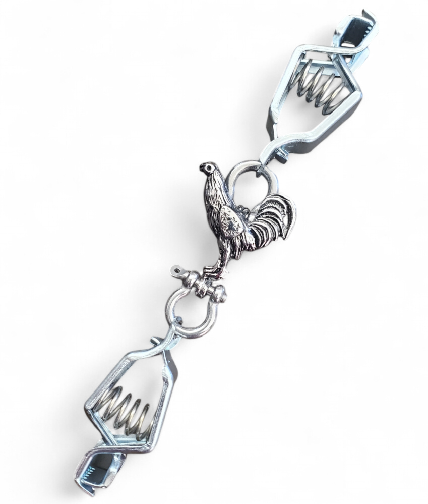 "Expertly hand-crafted double-clamp stainless steel glove clip, featuring an intricate and stunning gallo fino design. Built with durability and style in mind, this unique piece is both functional and a striking statement accessory."