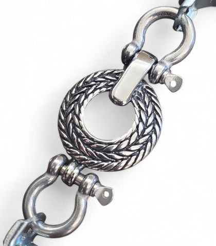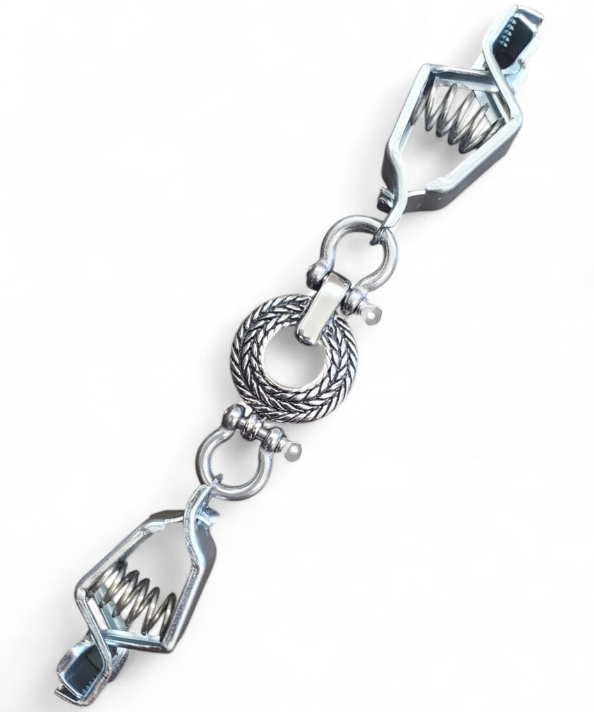 "Expertly hand-crafted double-clamp stainless steel glove clip, featuring an intricate and stunning roap lasso design. Built with durability and style in mind, this unique piece is both functional and a striking statement accessory."