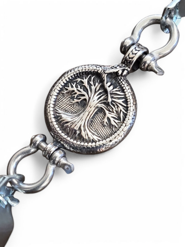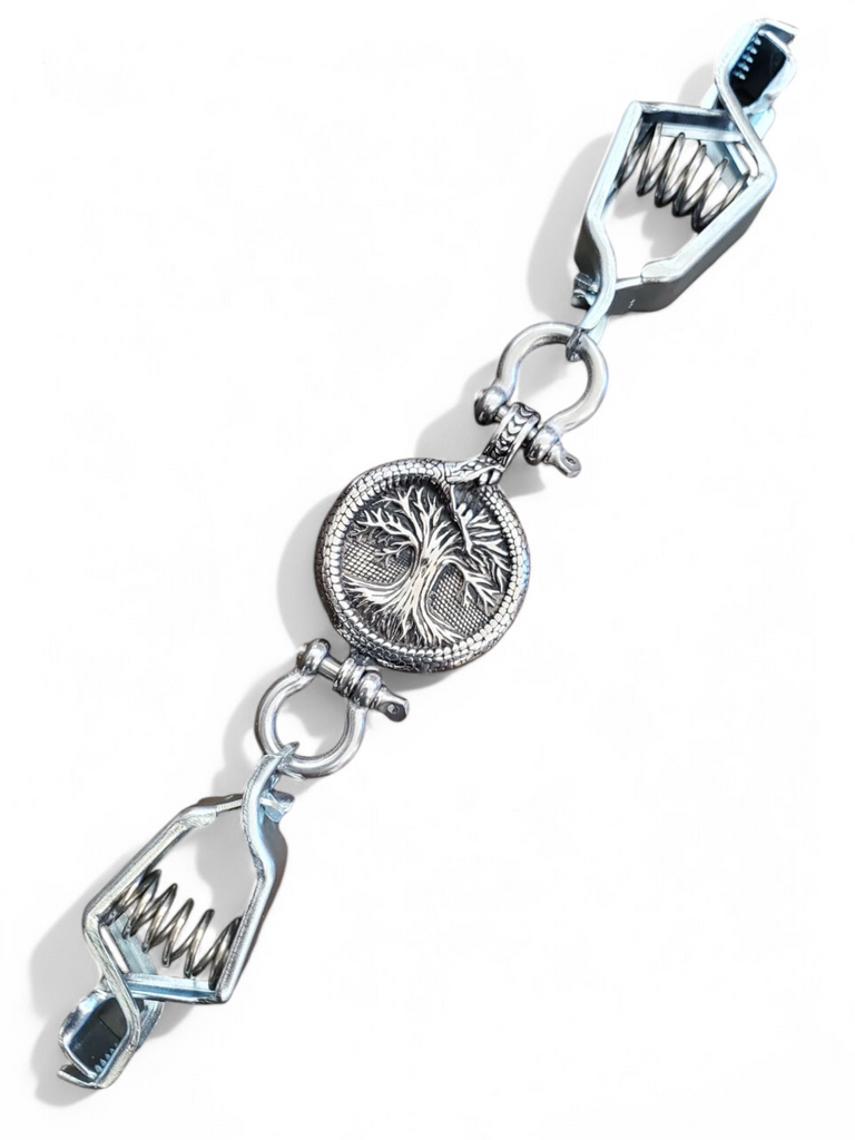 "Expertly hand-crafted double-clamp stainless steel glove clip, featuring an intricate and stunning Tree with serpent design. Built with durability and style in mind, this unique piece is both functional and a striking statement accessory."
